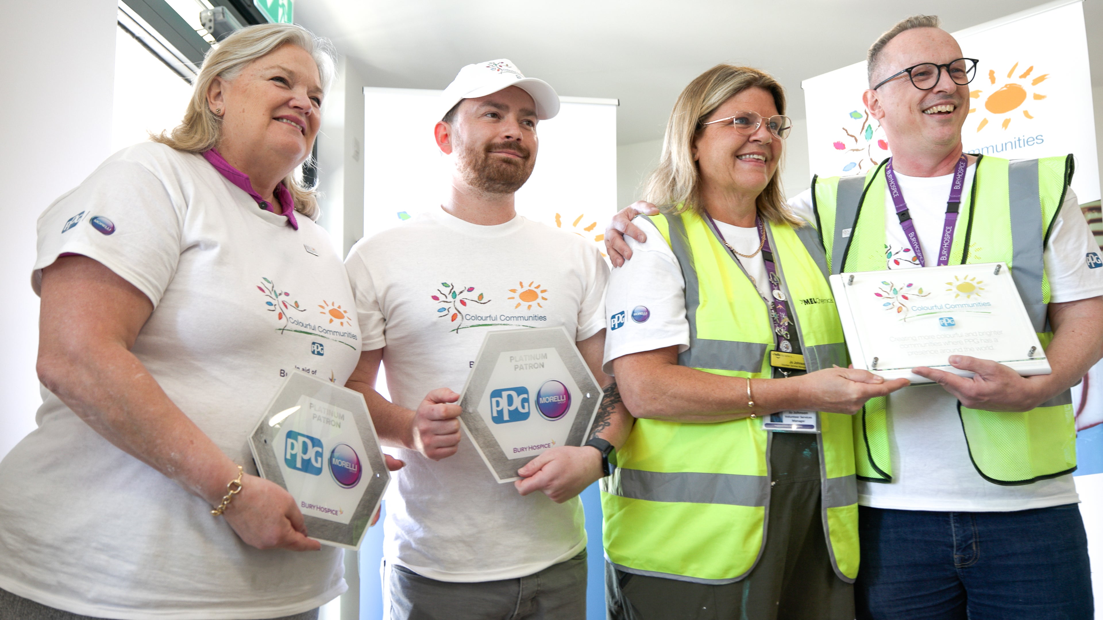 On April 5-6, 2025, over 100 volunteers from PPG and the Morelli Group enhanced Bury Hospice in the United Kingdom. The project transformed patient bedrooms, the main reception, café, family rooms, living room, corridors, treatment rooms, and staff areas, using a color palette featuring Purple Basil (PPG1046-7), PPG’s 2025 Color of the Year, which promotes healing and emotional well-being. Local artist Pocket Wren created a mural of the iconic Peel Tower, surrounded by flowers and birds, symbolizing hope and memories.