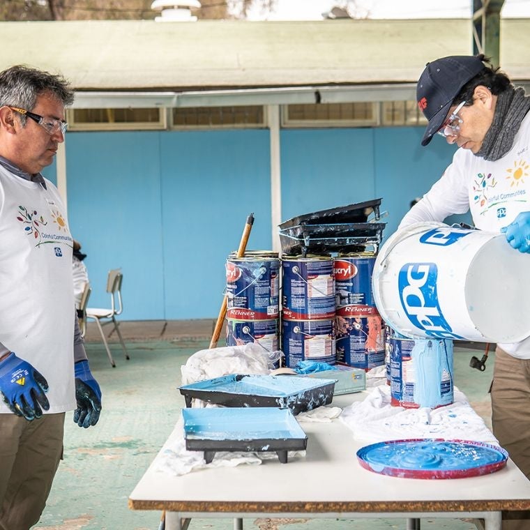 Armed with brushes, rollers and buckets of paint and enthusiasm, nearly 120 volunteers transformed a school outside of Santiago during our first-ever COLORFUL COMMUNITIES® project in Chile. Oscar Lazarte Arredondo, commercial manager for Protective and Marine Coatings (PMC) in Chile, and Alberto Guzmán Véliz, commercial director for Chile, led the milestone event.