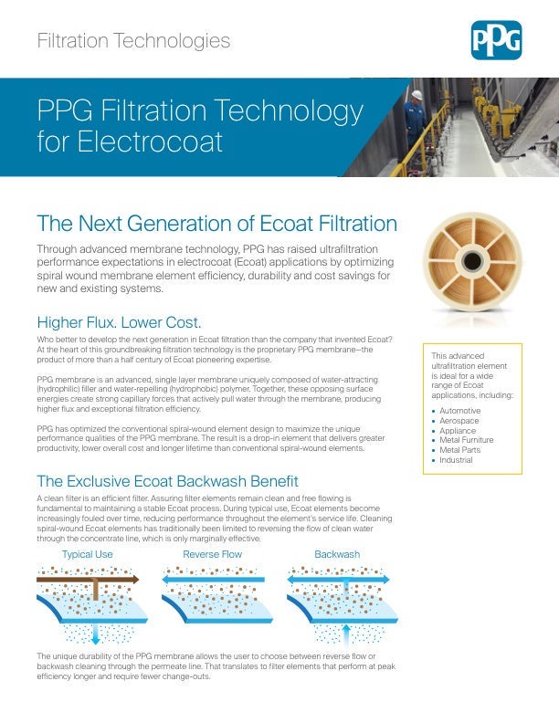 Welcome to the next generation of ultrafiltration (UF), designed specifically for electrocoat (e-coat) applications. PPG has raised the bar for filtration technology performance, delivering enhanced efficiency and durability as well as significant cost savings for automotive, aerospace, appliance, metal furniture, metal parts and other industrial uses.