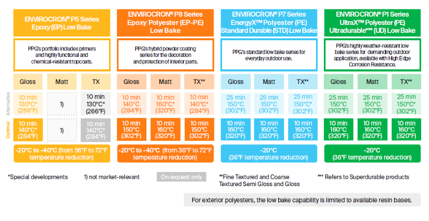 Some low-bake powder formulations can be cured at ultra-low temperatures. Solutions like PPG's ENVIROCRON® Low Bake powder coatings can cure at temperatures 20°C to 40°C lower than traditional powder coatings, around 250–260°F (121–127°C), helping to further reduce energy costs and CO2 emissions.