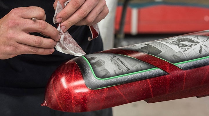 For this WWII-commemorative project, Morley applied a low tack, transfer paper to cover and protect the dècoupage. Then he mixed DBC500 with DMX212 red candy dye to create the striping and the overall candy color. Different tape widths were used for the striping and were unmasked in stages as additional coats of the candy color were applied. Additional black candy drop shadows enhanced the overall look. DC4000 clearcoat finished the work.