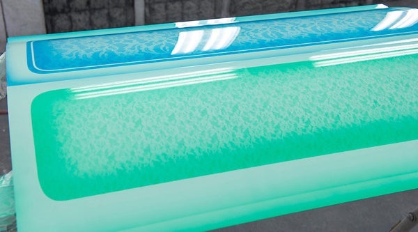 Creating a sharp pattern requires careful masking. "Make sure the lace is pulled tight to the panel so there are no wrinkles," Hollenbeck explains. "You have to stretch it a little bit, but you want to stretch it evenly. You don't want a gap between the panel and the lace."