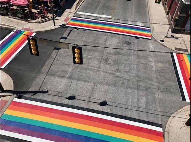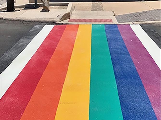 ENNIS-FLINT® by PPG TrafficPatterns® Interconnected Surface System in rainbow design mark the intersections of North Main Avenue and East Evergreen Street in San Antonio, TX. Accurate Pavement Striping, an Ennis-Flint certified applicator, applied the material on June 27, 2018. The rainbow crosswalks aim to enhance community pride and promote a message of inclusion and tolerance while providing pedestrian safety.