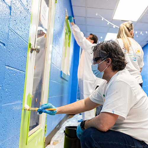 As part of PPG’s specialty products business’ leadership conference, a Colorful Communities project took place at Sunrise School in Monroeville, Pennsylvania. Sunrise School provides an enriching, challenging and inviting environment to all of the school’s special education students while facilitating the growth of productive citizens by instilling in their students the necessary skills to transition from the classroom to the community. Employee volunteers painted hallways, the cafeteria, and the STEM library.
